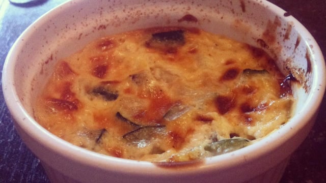 Battre l oeuf avec la crème liquide, les copeaux de comté et la gousse d ail écrasée. Ajouter au mélange courgette/oignon.