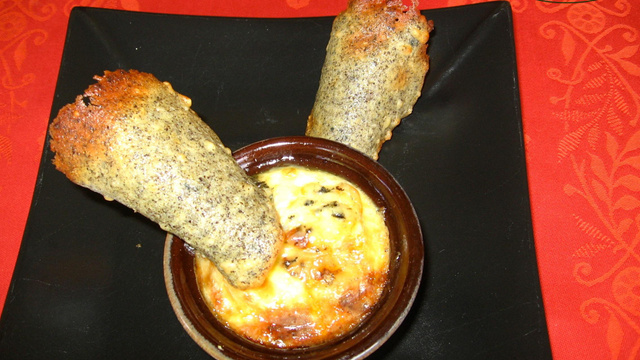 Un flan de poireau aromatisé à la fourme, accompagné de tuiles sucrées-salées.