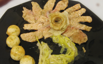 Peu avant de servir, on découpe le poireau en fine julienne et on le fait cuire 15 min dans l'eau bouillante salée. On dresse harmonieusement l'assiette en formant les pétales avec les lamelles de saumon et le coeur de la fleur avec le ruban de pomme. Les petites billes sur le coté de l'assiette. On égoutte bien le poireau, on le place de façon encore à former la tige et la feuille et on arrose d'un peu de marinade et de fleur de sel.