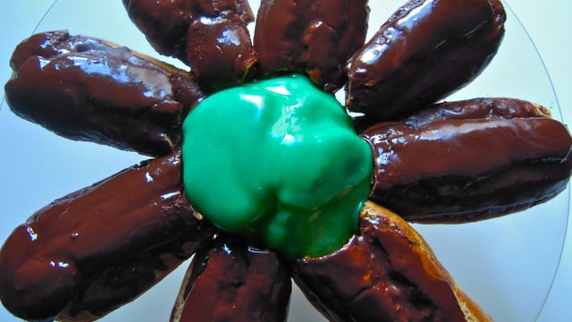 - 7Glaçage vertFondre le fondant au bain-marie. Ajouter le colorant. Bien mélanger. Tremper le chou dedans (le dessus) plusieurs fois s'il le faut.