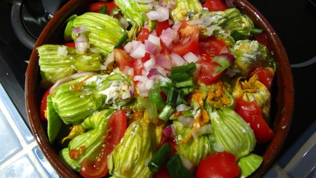 Couper vos courgettes en lamelles et les mettre au fond d'un plat en terre avec du gros sel et de l'huile d'olive. Ajouter les tomates, l'oignon frais sur le dessus et poser vos fleurs de courgettes dessus.
