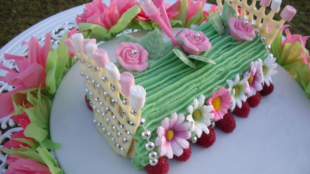 Surmontez chaque petits piques des couronnes en chocolat blanc, de mini-marshmallows en alternant leurs couleurs (roses et blancs ici). Mettez la crème anglaise aux pralines roses dans des micro-pipettes, et insérez-les en biais au centre du gâteau pour le décorer joliment. (voir photo). Finalisez le décor de la bûche en disposant des roses et des feuilles en sucre. Ajoutez aussi quelques perles de sucre argentées. Puis, dans la partie inférieure de chaque longueur du gâteau (voir photo), disposez les framboises précédemment réservées pour le décor (la disposition de ces framboises doit former un petit liseré fruité de chaque côté du gâteau). Surmontez ces framboises, de petites fleurs artificielles roses et blanches en prenant soin d'alterner leurs couleurs. Réservez cette bûche gourmande au réfrigérateur jusqu'au moment de servir.