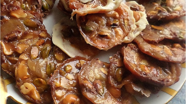 Faire bouillir la crème, le beurre, les sucres et le miel. Mélanger, puis ajouter peu à peu la farine tamisée, la poudre d'amandes, les pistaches et les noix de cajou.