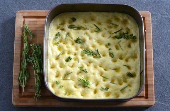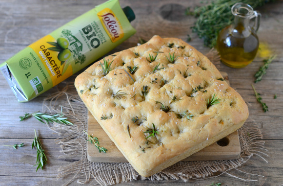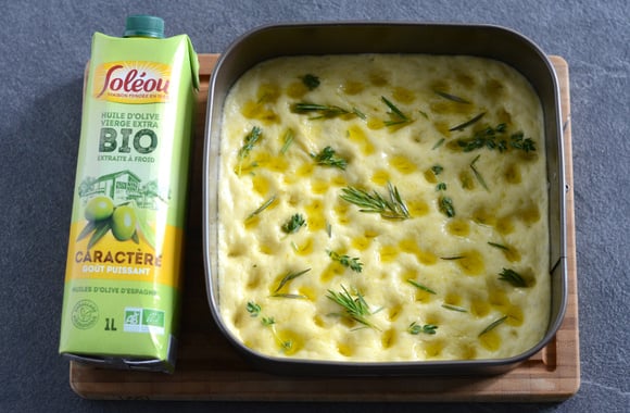 Une focaccia très moelleuse, parfumée avec une bonne huile d'olive de caractère Soléou et des herbes aromatiques.