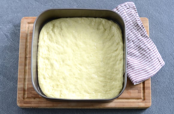Mettez la pâte dans un moule carré de 20x20 cm que vous avez préalablement huilé et étalez la pâte dans le moule, en l’étirant à la main.Couvrez le moule d’un linge propre puis laissez pousser 1 heure dans un endroit tiède.