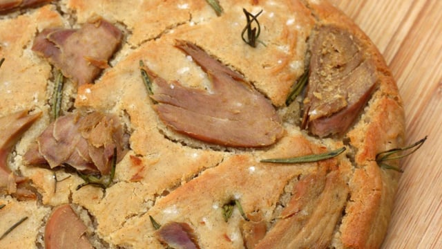 Foccaccia sans gluten, croûte croustillante et fondante.