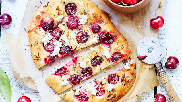 Déposez votre boule de pâte à pain sur un plan de travail bien fariné. Étalez celle-ci a l'aide d'un rouleau sur 1 cm d'épaisseur, déposez la pâte sur une plaque recouverte de papier de cuisson allant au four. Avec votre doigt, appuyez fermement de manière à former des trous dans la pâte, placez une moitié de cerise dans chaque trou. Écrasez le fromage à l'aide d'une fourchette et déposez les morceaux de fromage sur la pâte, Arrosez le tout d'huile d'olive et parsemez de romarin frais, salez et poivrez à votre convenance.
