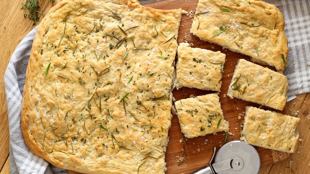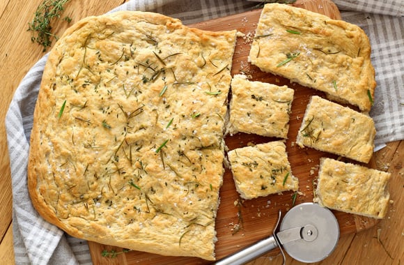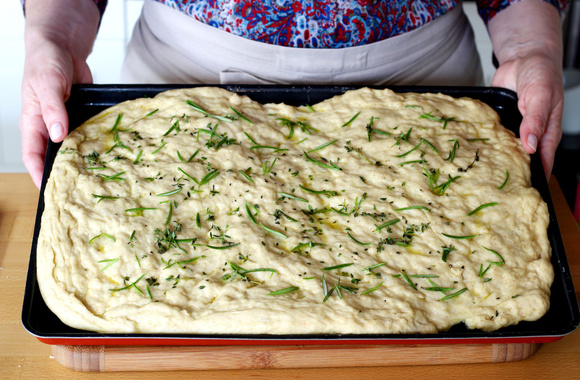 La focaccia italienne est reconnaissable grâce à ses creux qui à la cuisson s'imprègnent d'huile d'olive, d'herbes et de fleur de sel. C'est un délice.
