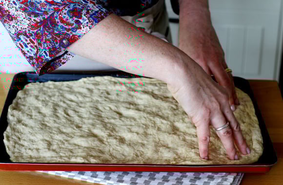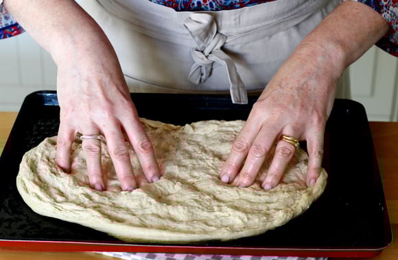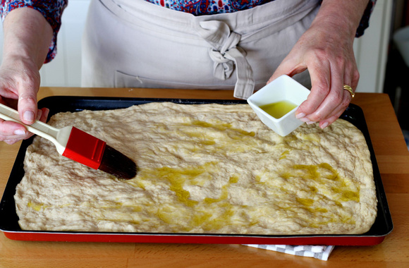 6Huilez une plaque de cuisson, versez la pâte levée puis avec vos doigts à la verticale, étalez petit à petit la pâte sur toute la plaque, en faisant des creux avec vos doigts.