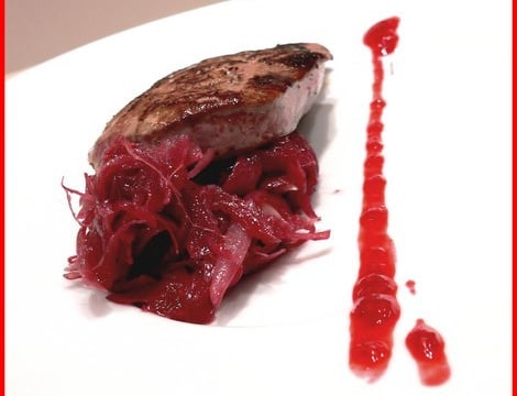 Disposez la compotée d'échalote dans des assiettes chaudes et posez vos tranches de foie de veau dessus.