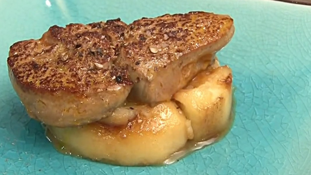 Essuyez votre poêle et faites chauffer. Assaisonnez votre foie gras, faites colorer de chaque côté (le foie gras doit être bien frais). Disposez sur du papier absorbant pour retirer l’excès de gras. Retirez le cercle à pâtisserie, ajoutez votre tranche de foie gras, et ajoutez un tour de poivre. Servez de suite.