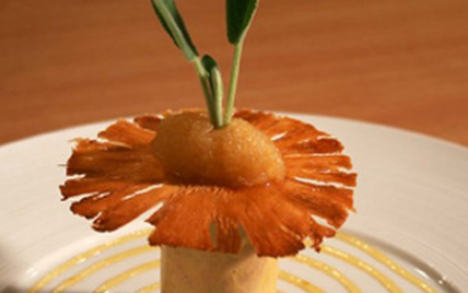 Présentation : Tailler un cylindre d'environ 5 cm de hauteur, disposer dessus la chips et la pulpe d'ananas et décorer avec une branche de sauge. Disposer le jus réduit autour.