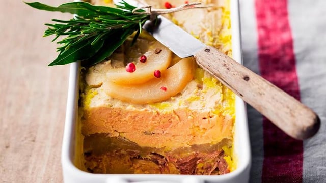 Coupez le foie en tranches épaisses. Tapissez une terrine de papier sulfurisé, déposez des tranches de foie au fond, arrosez d'un bouchon d''armagnac puis de sel, placez de l''effiloché de canard et une couche de poires en lamelles.