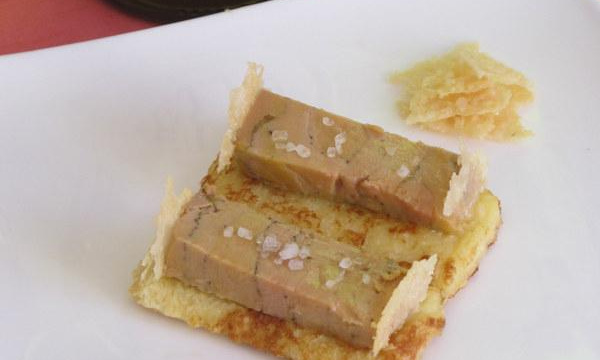 - Au moment de servir, disposer le foie gras sur les tranches de pain perdu, rajouter les tuiles de parmesan au milieu