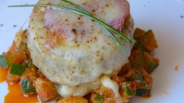 Des cœurs d"artichauts farcis avec des courgettes accompagnés d"une sauce tomate, poivrons, aubergines et le tout surmonté de jambon fumé et de mozzarella. C"était léger, goûteux et délicieusement bon, on s"est régalé.