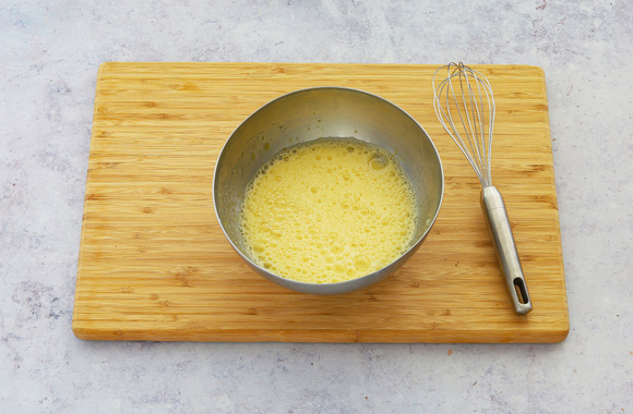 Dans un autre bol, fouettez les œufs avec le sucre, jusqu'à ce que le mélange blanchisse et devienne mousseux.