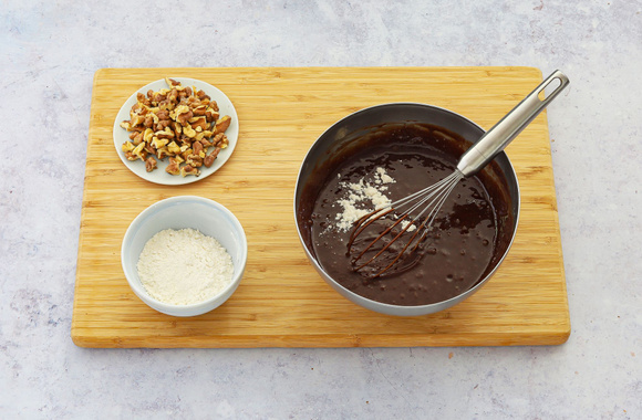 5Ajoutez le mélange de chocolat et huile de Noix du Périgord AOP tiédi, fouettez de nouveau.