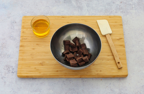 3Cassez les chocolats en carrés, versez-les dans un bol qui supporte la chaleur. Ajoutez l'huile de Noix du Périgord AOP. Faites fondre au bain-marie. Hors du feu mélangez à la maryse et laissez tiédir.