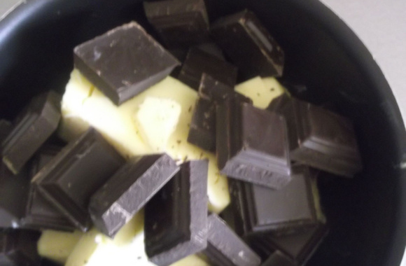 1Préchauffer le four Th.5 dans une petite casserole mettre le beurre coupé grossièrement avec le chocolat coupé en carré mettre à chauffer à feu doux en remuant de temps en temps le mélange doit être bien homogène.