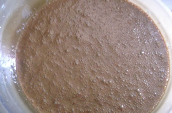 2Dans un plat fouetter les 5 œufs y ajouter la préparation beurre chocolat la cuillère à soupe de farine le sucre glace bien mélanger la pâte doit être bien homogène et un peu liquide.