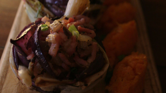 Dressage : Superposez une couche de support d'oignon blanc et d'oignon rouge et les remplir de pétales rôties et les allumettes aux oignons caramélisés.
