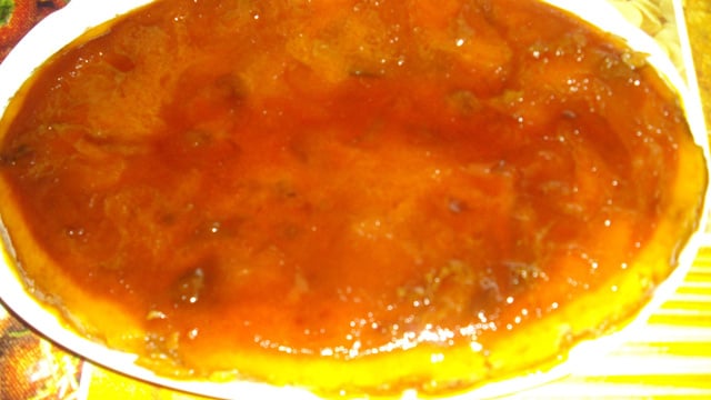 Ensuite verser la préparation dans le moule et mettre les fruits en les enfonçant bien mettre votre plat avec la préparation dans un moule au bain marie. Cuire 45 ou 50 minutes suivant votre four laisser bien tiédir et déguster bien frais.