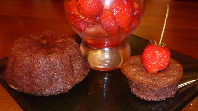 Un fondant au chocolat avec une fraises a l'intérieur qui donne une touche de douceur au chocolat accompagner d'une vérine de fraises en sirop.