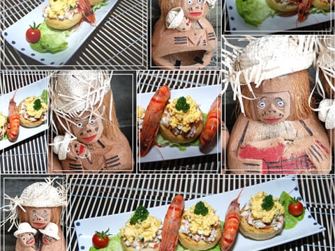 Gardez 8 gambas entières, le reste les décortiquer, enlevez le boyau et coupez les en petits cubes que vous mélangez avec les cubes de blanc d'oeuf , ajoutez une pincée de paprika, réservez. - 2