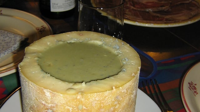 Prendre 1/2 fourme de Montbrison, la vider en gardant environ 1 cm d'épaisseur sur le fond et le tour car cette croûte servira de contenant.
