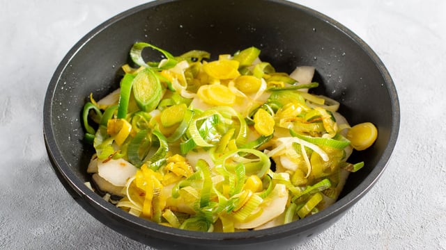 Si vous utilisez du blanc et du vert de poireau, poursuivez la cuisson d'une minute, si jamais à la fin de la cuisson le vert n'est pas encore complètement cuit. Ce devine, étant plus fibreux, cuit plus longtemps que le blanc de poireaux.