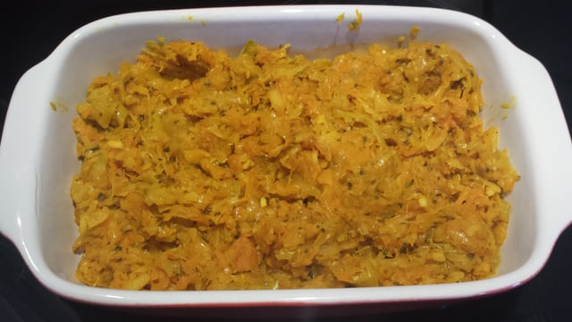 Une fois émincés et rapés, mettez les légumes dans la poêle et ajoutez le jus d'orange, un peu de coriandre, le sel et le poivre. Couvrez et laissez cuire à feu doux pendant 10 min, puis ajoutez le lait de coco. Laissez encore cuire à feu doux, pendant 15 à 20 minutes (en fin de cuisson, le liquide doit être complètement évaporé).