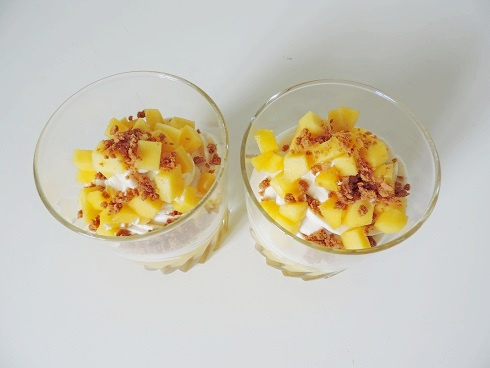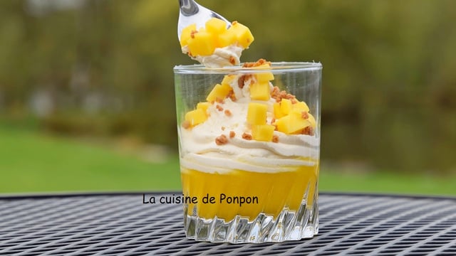 3Garnir de dés de mangue et de crumble spéculoos. Réserver au frigo jusqu'à la dégustation.