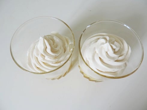2Pendant ce temps, battre en chantilly le mascarpone avec la crème fraîche, le sucre fin et l'extrait de vanille. Placer la chantilly dans une poche à douille et douiller sur la purée de mangue dans les verrines.