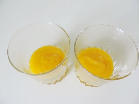 1Récupérer la chair de la mangue, prélever une belle tranche qui sera coupée en dés pour la déco. Mixer le reste avec la cs de sucre fin, la cs de sirop de gingembre et répartir dans les 2 verrines. Réserver au frigo.