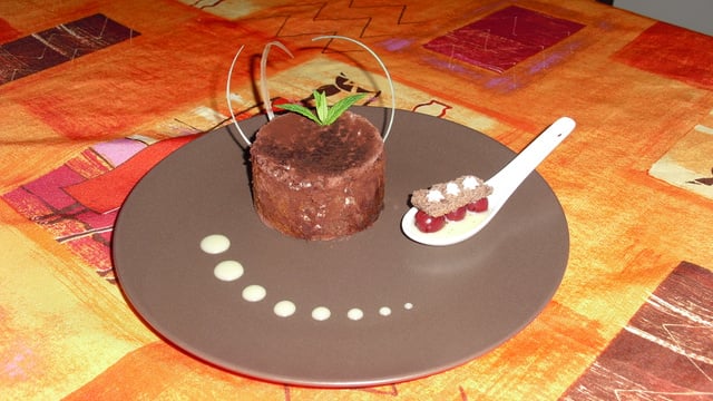 Réaliser des points avec la sauce au chocolat blanc. Dans une cuillère en porcelaine, mettre au fond de la sauce chocolat, 3 griottes, un morceau de génoise et des pointes de mousse chocolat blanc. Démouler le cercle dans une autre assiette, et saupoudrer le gâteau avec du cacao en poudre, puis le dresser dans l'assiette final. Ajouter un brin de menthe et des décors en sucre tiré.