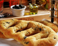 Mettre les ingrédients dans l'ordre donné un par un et sélectionner le programme pâte de votre machine à pain, une fois la pâte prête façonner la fougasse sur la plaque du four fariner et laisser reposer 45 minutes, puis badigeonner la fougasse d'huile d'olive et enfourner dans le four préchauffer au prealable pour 20 à 30 minutes, thermostat 7.