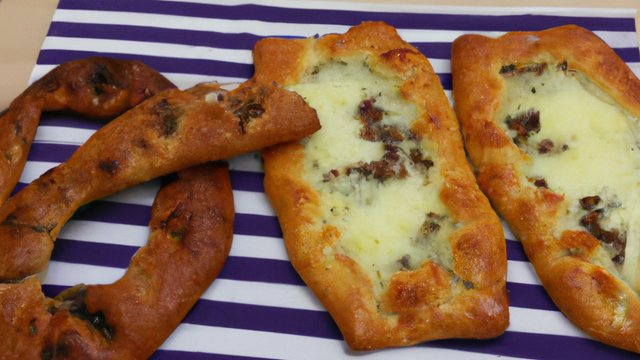 Étalez la pâte en forme de rectangle, disposez les tranches de fromage sur une moitié et parsemez de graines de carvi. Repliez l'autre moitié en pinçant les bords. Découpez des fentes en forme de feuille (Monstera).