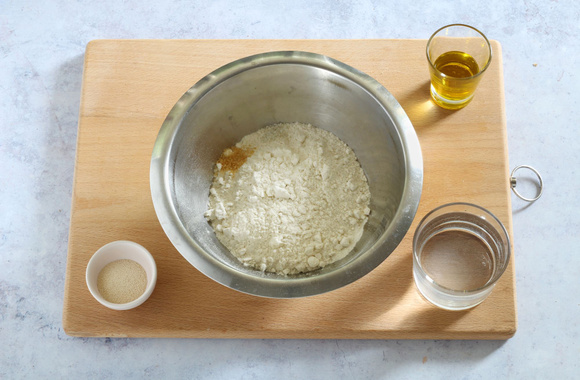 1Dans un saladier, mettez la farine, le sel et le sucre. Ajoutez la levure sèche.