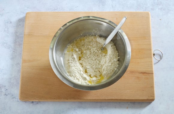2Creusez un puis, versez au centre l’eau tiède et l’huile d’olive.