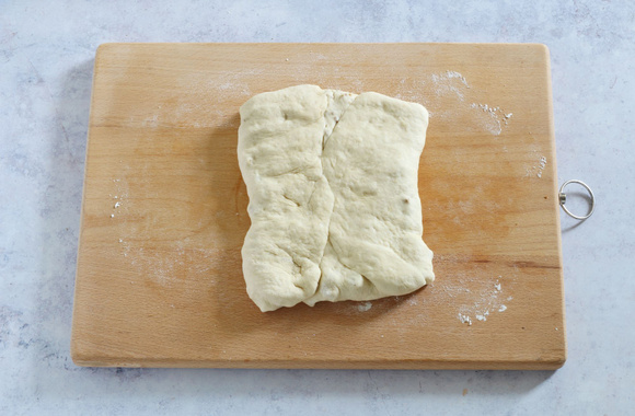 8Repliez la pâte en portefeuille, tournez-la de 90° et abaissez-la en l’étalant légèrement avec la paume de votre main.