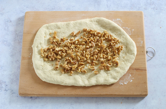 7Étalez la pâte avec les mains, ajoutez les cerneaux de Noix du Périgord AOP.