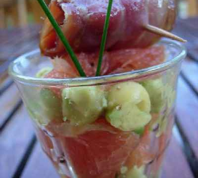 Alterner dans les verres les couches d'avocat et de pamplemousse. Saler et poivrer, mettre quelques brins de ciboulette.