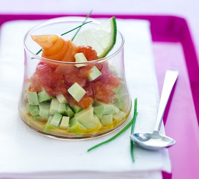 Coupez le saumon en fines lanières et réservez.Pelez et râpez le gingembre. Epluchez et ciselez l'oignon rouge puis faites-le suer avec le gingembre et un filet d'huile d'olive dans une casserole. Ajoutez les segments de pamplemousse, les zestes, le miel, le vinaigre de vin, le sel et le poivre et laissez cuire à feu doux pendant 20 min. Laissez refroidir ce chutney à température ambiante pendant 30 min.Pelez et coupez en petits dés les avocats. Disposez l'avocat dans le fond d'une verrine. Ajoutez le chutney et décorez de lanières de saumon fumé et de brins de ciboulette.