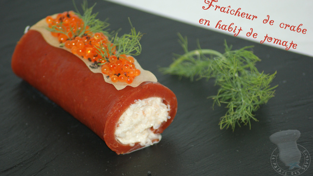 Dans la plaque de tomate gélifiée, découper 4 rectangles de 10x12cm. Au 1/3 du rectangle, déposer une ligne de crabe, rouler en vous aidant du film cuisson afin de former un rouleau.
