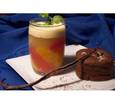 Dresser dans un verre quelques agrumes et remplir de jus au miel. Au dernier moment fouetter la crème liquide de manière à la rendre mousseuse, et la verser sur le dessus du verreComment réaliser le fondant au chocolat:Mettre à fondre au bain marie beurre et chocolat
