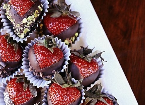 Tremper esthétiquement vos fraises dans le chocolat. Saupoudrer directement de pistaches écrasées ou de copeaux de chocolat.