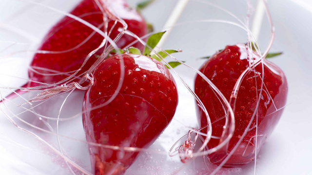 Délicieuse fraise nappée d'un caramel rose...