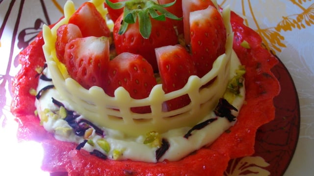 Versez uniformément votre crème sur le fond de vos pâtes, posez votre clôture, parsemez de pétales d'hibiscus coupées en petits morceaux et de pistaches concassées. Faites de belles découpes de vos fraises et posez-les dans l'espace qui leur est dédié.