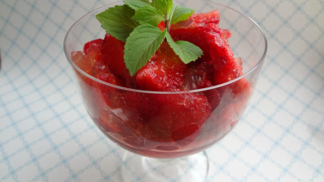 Le lendemain, répartir les fraises (valées et équeutées) dans quatre coupes. Avec une fourchette, casser la gelée de cannelle dans le pot de confiture de façon à en faire de petits dés de gelées. Répartir dans les trois coupes. Décorer d'une feuille de menthe.