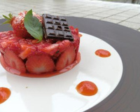 Poser le sablé sur l'assiette, recouvrir des fraises marinées, sur le dessus déposer la fraise caramélisée. Réaliser des petits points de caramel de tomate à l'aide d'une cuillère.